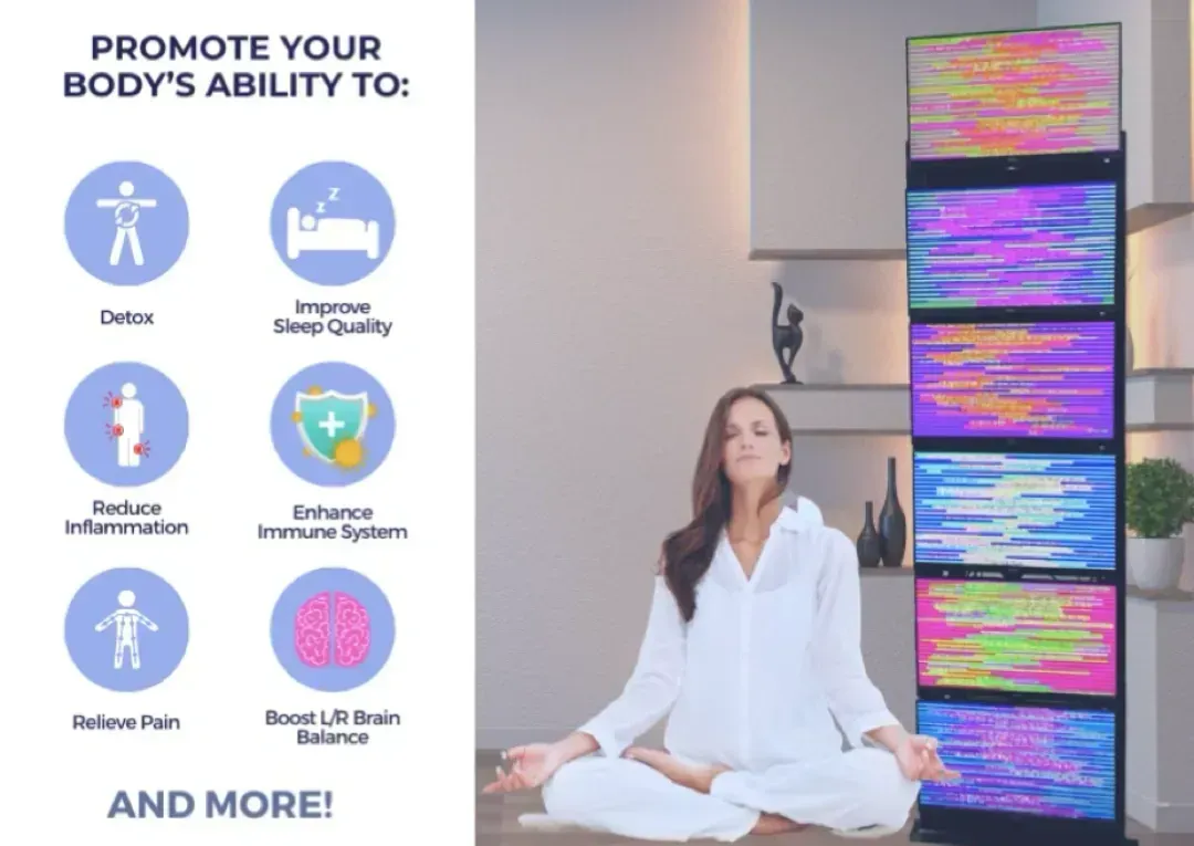 The EESystem™ generates multiple bio-active life-enhancing energy fields, including scalar waves, PEMF (Pulsed Electro Magnetic Field), polychromatic light and Fibonacci sequences. This stimulates cellular repair, improves immune function, reduce stress, relieve pain, detoxifies the body, elevates moods, promotes deep states of relaxation and mental clarity, assists in balancing right and left hemispheres of the brain to increase energy levels and gives a greater sense of peace and alignment.